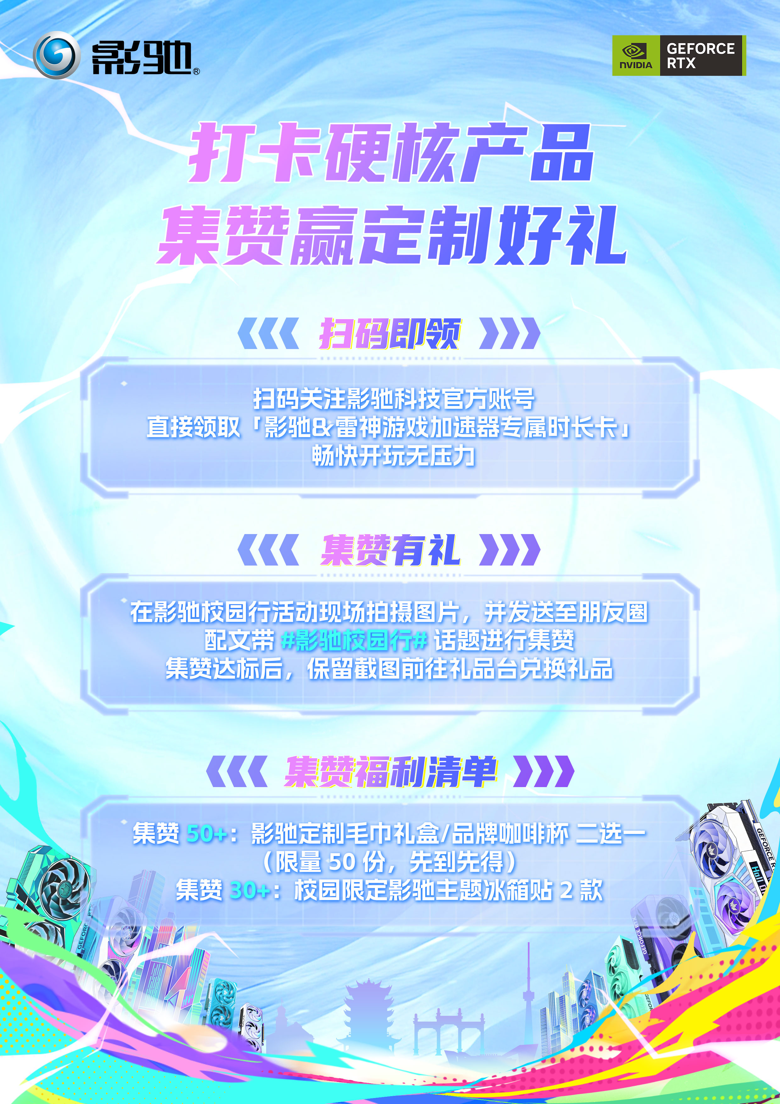 本次校园行活动我们将以极具创意的快闪形式,打造一个专属于硬件爱好者的科技潮玩新地标!现场不仅会展示多款影驰RTX 50系列显卡,更有高性能主机体验等着你!另外,现场打卡并分享至社媒,即可免费领取影驰精美周边!轻松一步,把逛展的快乐带回家。