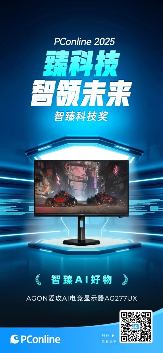 近日,由太平洋科技主办的 PConline 2025 智臻科技奖评选结果揭晓。AGON爱攻全新发布的 AI 定制芯片 的电竞显示器 AG277UX,凭借 AI 与双模技术的创新应用,一举斩获 PConline 2025 智臻科技奖显示设备品类“智臻AI好物”奖项!