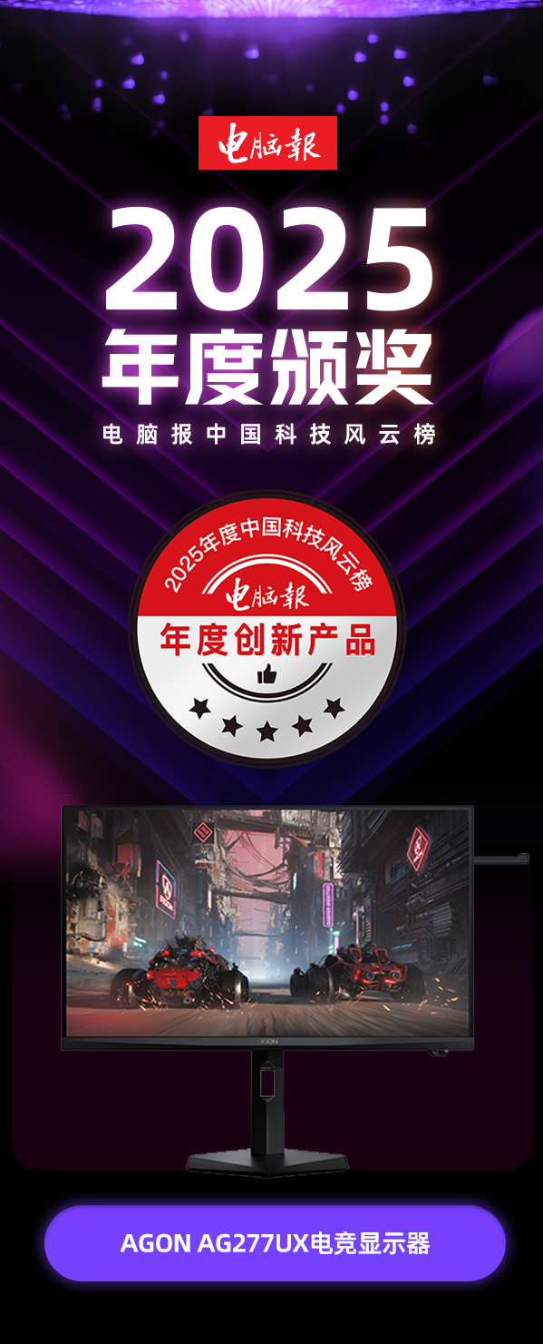 近日,《电脑报》2025年度中国科技风云榜重磅揭晓!在这场汇聚顶尖科技成果的年度盛典中,AGON爱攻 AI 定制芯片 电竞显示器 AG277UX,凭借 AI 与双模技术的创新应用,在激烈的角逐中脱颖而出,一举斩获 “年度创新产品” 大奖!